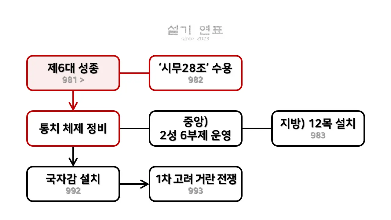 - 성종은 당의 3성 6부제를 받아들여 고려의 실정에 맞게 2성 6부제로 운영하였음.