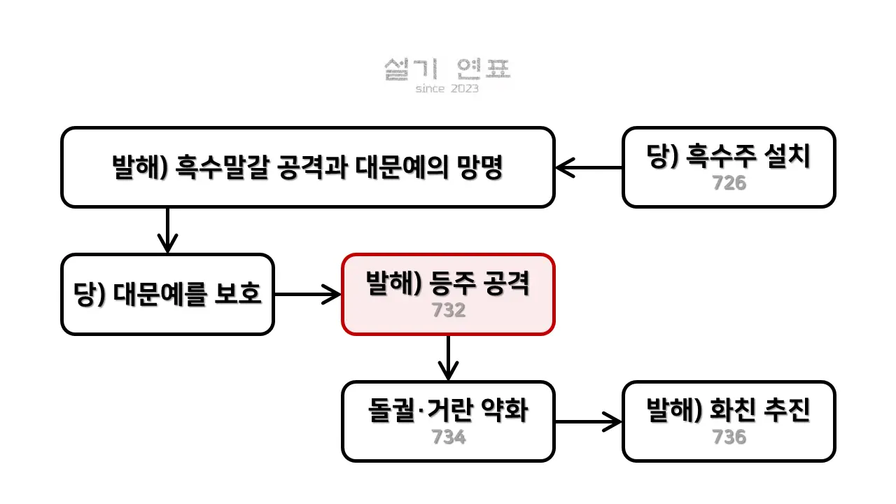 ▶ 732년 9월 발해는 장문휴를 보내 당의 등주(오늘날 중국 산둥성)를 공격해