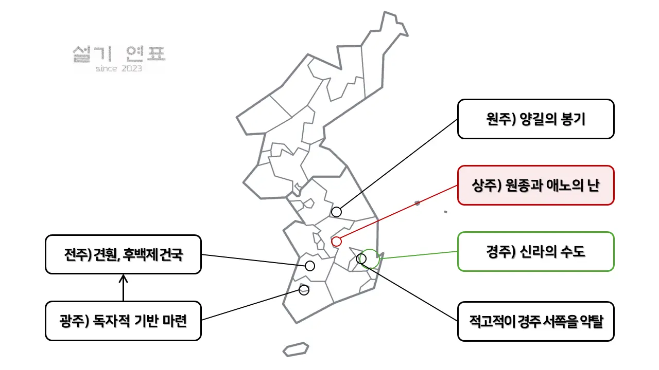 ▶ 889 사벌주(지금의 경상북도 상주)에서는 ⚔️원종과 애노의 난이 일어났고,